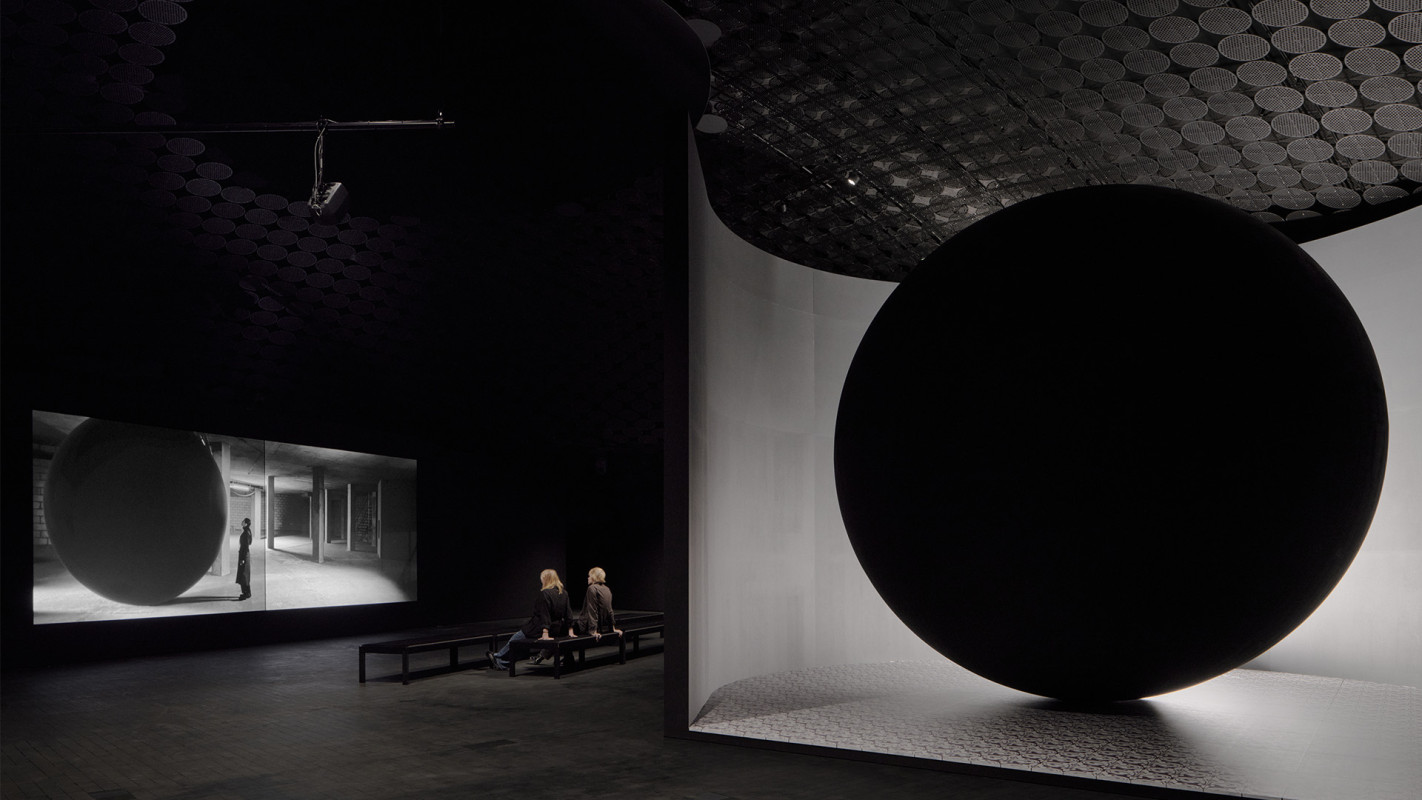 A large, black spherical object, hidden from direct sight, waits for the viewer in the exhibition space. A sound originating in low-frequency vibrations resonates around the motionless monument and settles deep inside the viewer’s body like a trauma. The sculpture is so impenetrably black that it reflects no light at all, creating an optical illusion. With our sense of sight alone, it is virtually impossible to envisage the three-dimensional nature of this profound blackness, accentuating its pervasive, menacing quality that is as hard to grasp as a complex emotion.