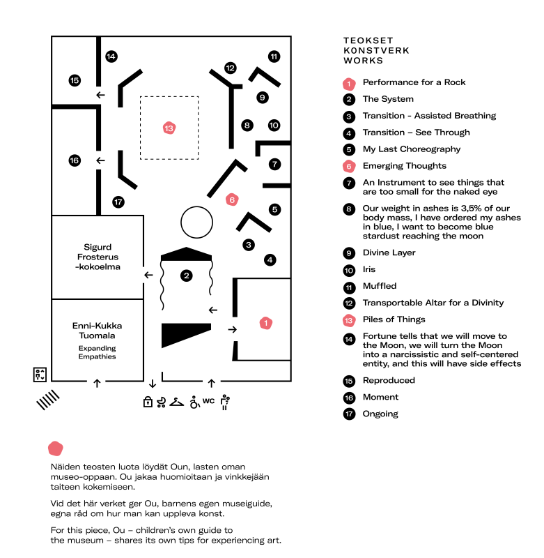 Ou on lisännyt vinkkinsä näyttelyn seinille kolmen teoksen kohdalla: