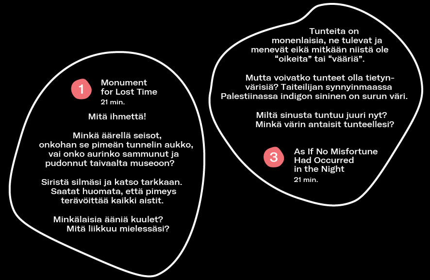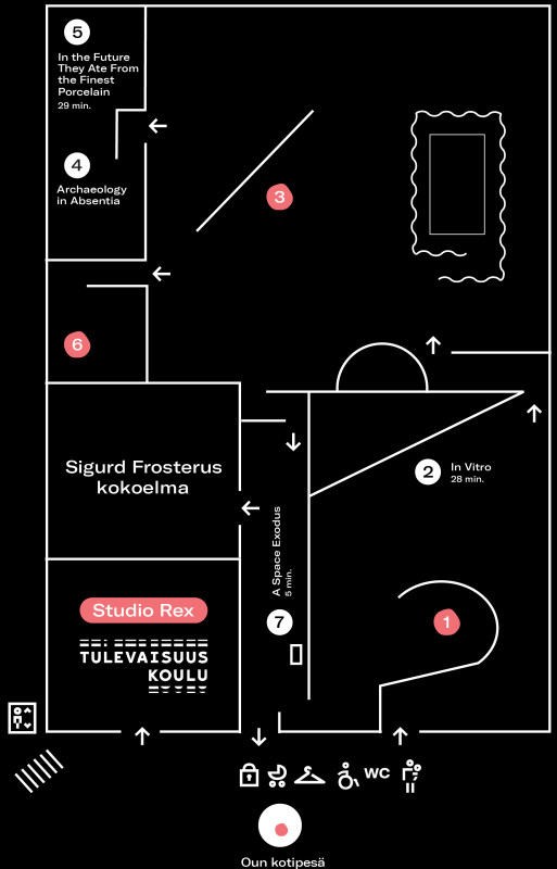Näyttelyssä on liikkuvaa kuvaa ja monikanavaista ääntä, joka voi aiheuttaa kehollisia tuntemuksia.