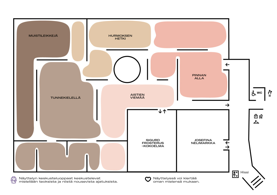 Näyttelyn nimi viittaa – Kari Cavénin monimerkityksisen teoksen lisäksi – tunteiden liukuvuuteen ja hetkellisyyteen. Myös näyttelyn teemat sulautuvat toisiinsa muodostaen risteäviä polkuja, joita jokainen voi astella omaa kokemustaan kuunnellen. Kokoelmateosten keruuseen ja esittämiseen liittyy aina vallankäyttöä; valinnoilla rakennetaan tulevaisuuden taidehistoriaa, ja sitä kautta käsitystämme ympäröivästä maailmasta. Nämä valta-asetelmat nivoutuvat osaksi niitä monia tulkintoja, joita eri ihmiset tekevät kohdatessaan näyttelyyn esille valitut teokset. Sekä museotyöntekijöiden että museokävijöiden tunteet kietoutuvat yhteen taiteen keskellä.